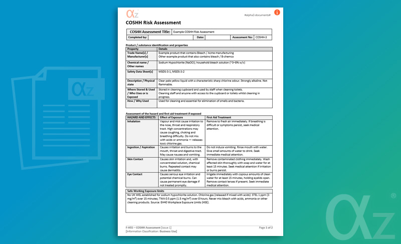 This example COSHH risk assessment has been prepared using the
