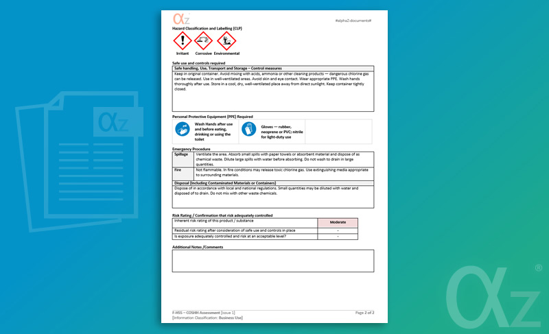 This document provides ready-to-use evidence of COSHH compliance and supports occupational health and safety management. The assessment is based on the F-HS5 COSHH Assessment template, is fully editable in Microsoft Word, and can be customised with your company details, site-specific information and review dates.