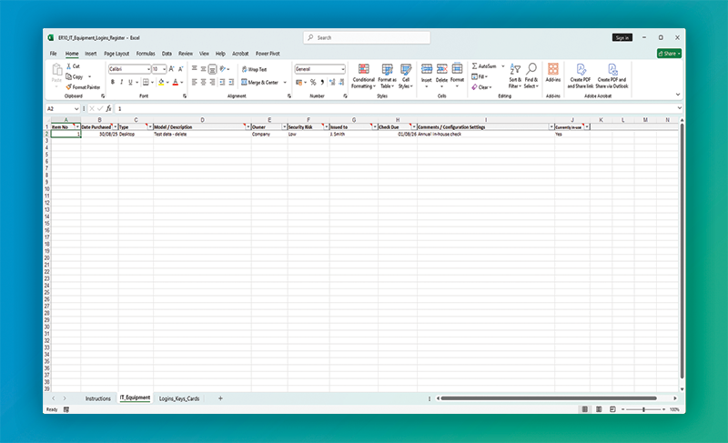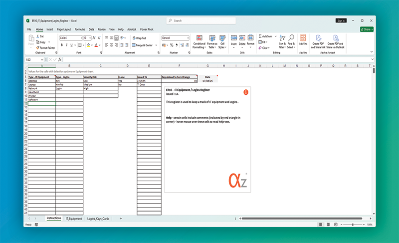 Register has a worksheet setup for listing of IT Equipment including; Item No., date purchased, type (controlled entry field), owner, security risk, issued to, check due (conditional formatting on this field to highlight when item due for check or overdue) comments and current status.