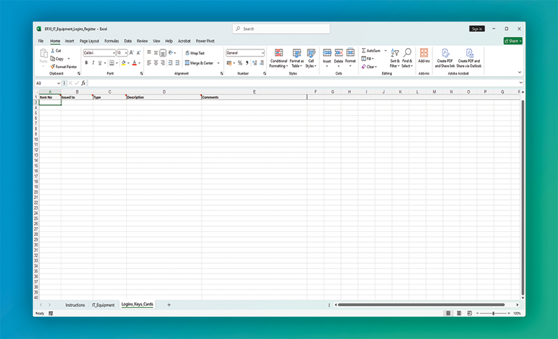 Separate worksheet for Logins / Keys / Cards where details of any logins, keys or security access cards issued to staff can be logged and managed.