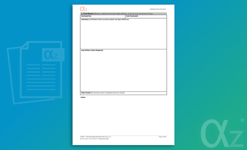 Form for logging and reviewing details relating to a suspected or reported personal data breach.