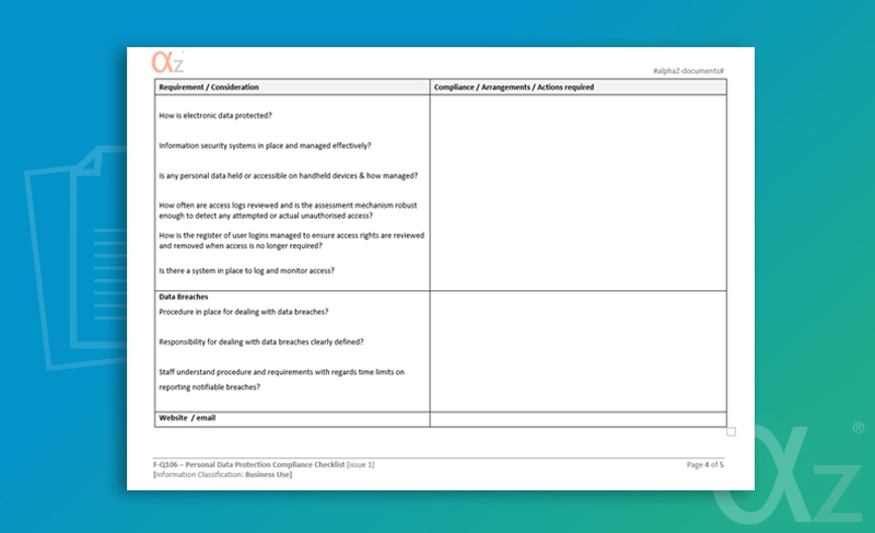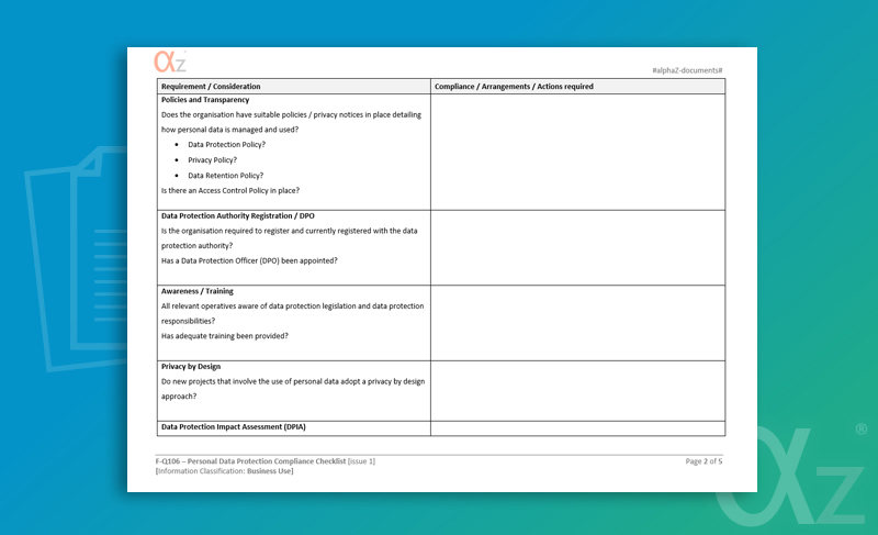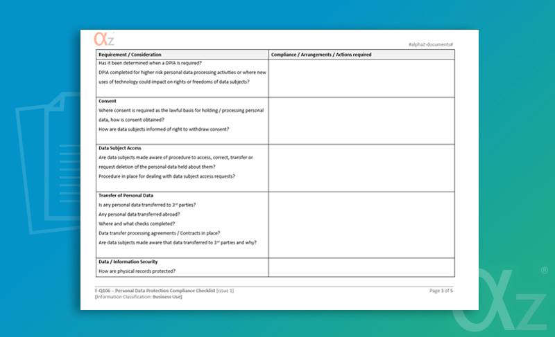 This form can be used by companies as both guidance and a checklist to ensure that the correct procedures, documents and controls are in place to comply with the EU General Data Protection Regulations.
